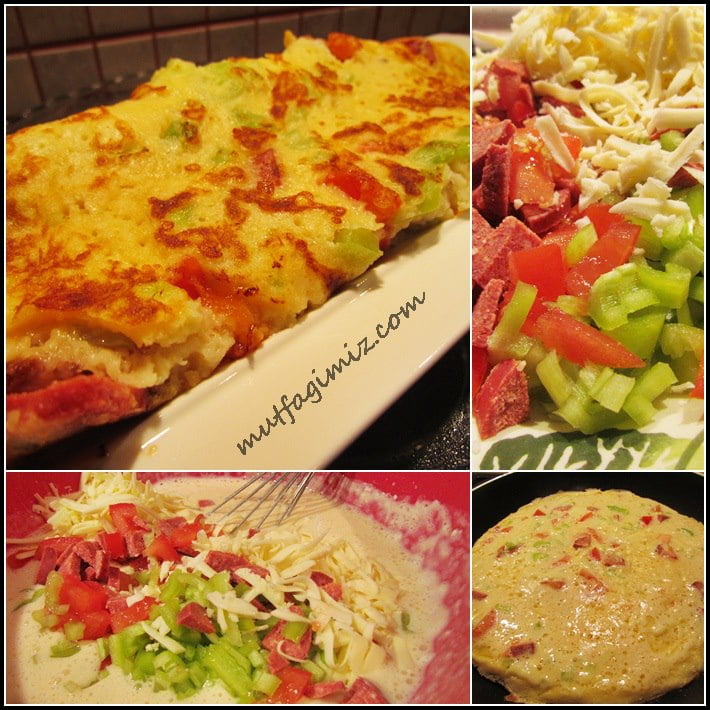 Domates , biber , sucuk minik minik kesilir . Derince bir kapta yumurta , süt ,su, un iyice çırpılır .